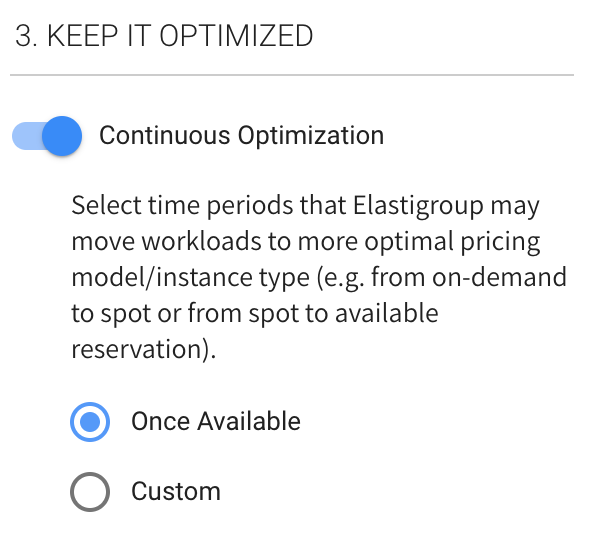 • Continuous Optimization: If fallback to on-demand instances has occurred, you can choose when your workload should be returned to spot instances or moved to an instance type that has already-purchased an available reserved capacity. Switch this On (default) to return the instances automatically.