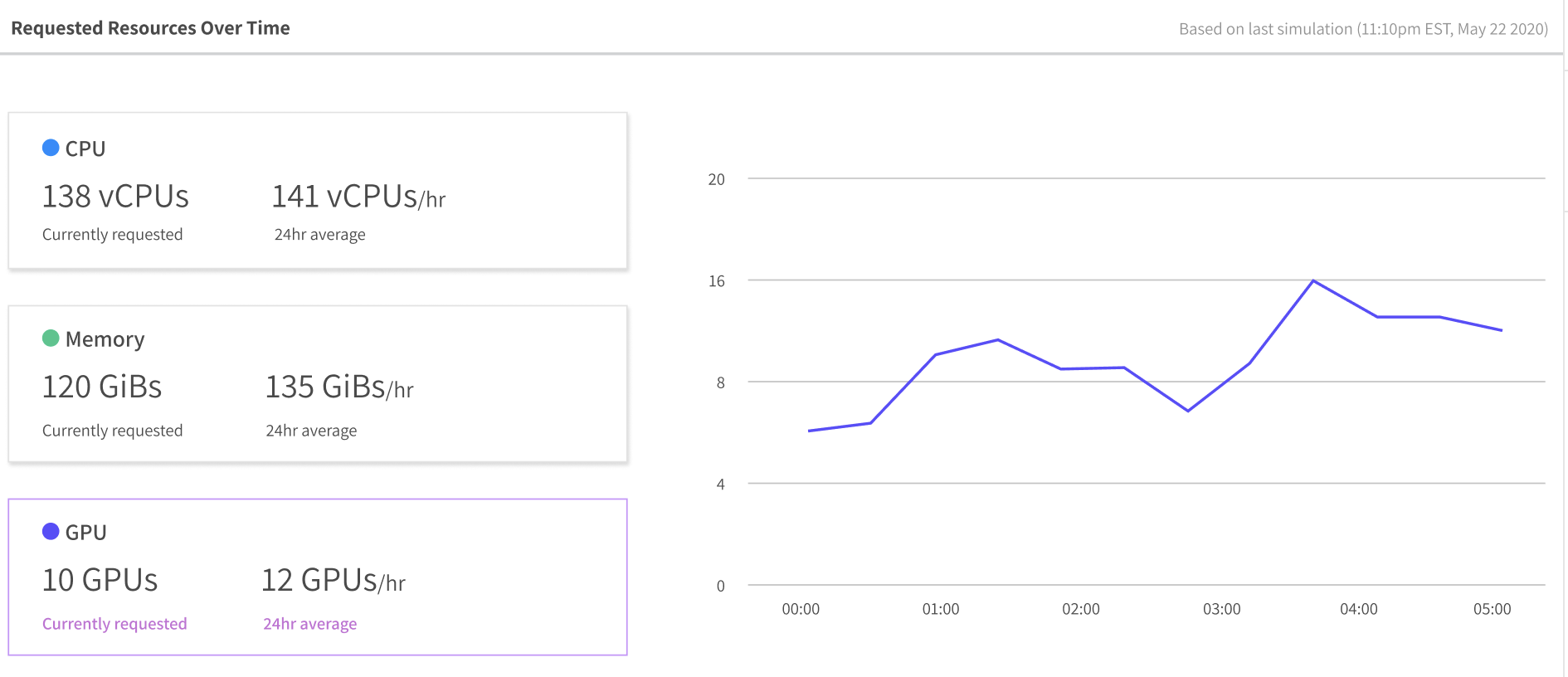 Insights presents information about the resources requested by your cluster. This includes the current amounts and the average values of vCPU, memory, and GPU resources requested by your workloads. When you click on a tile, you can see the corresponding trend chart up to the last 24 hours.